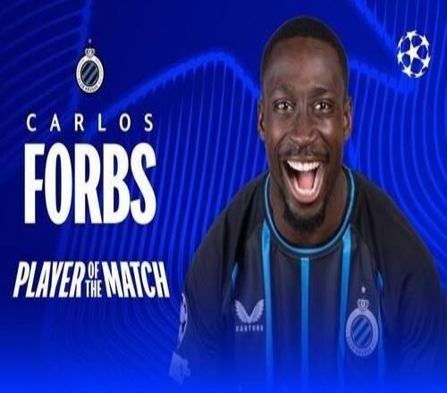欧冠联赛阶段第四轮,布鲁日主场3-3战平巴塞罗那,此役贡献2球1助的布鲁日前锋卡洛斯-福布斯当选欧冠官方全场最佳球员。此役主场对阵巴塞罗那,首发出战的卡洛斯-福布斯在上半场